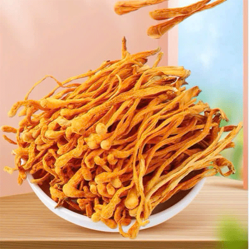 Nấm đông trùng hạ thảo sấy khô: vàng ươm, mùi rất thơm. Khi pha trà màu vàng óng ánh rất đẹp mắt, khi uống vị tanh nhẹ, khi nấu lẩu ăn ngon giòn.